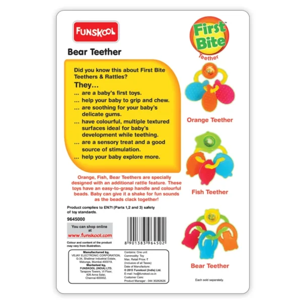 Funskool’s Bear Teether is built to meet international safety standards (EN 71 and ASTM F964), ensuring your baby gets nothing but the best. It’s lightweight, easy to grip, and perfect for teething relief at home or on the go!