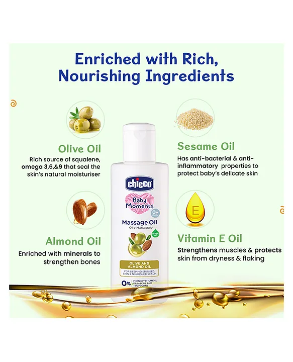 Nurture your baby’s delicate skin with Chicco Baby Moments Massage Oil, a non-sticky, quick-absorbing oil designed for daily massage. Enriched with Rice Bran Oil and Vitamin E, it deeply nourishes, moisturizes, and helps maintain soft, glowing, and healthy skin.