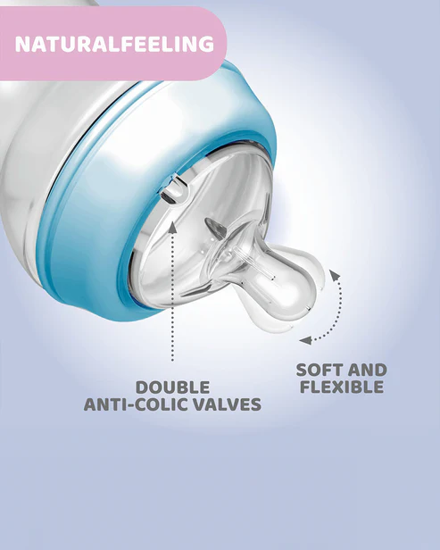 The Chicco Natural Feeling Feeding Bottle is carefully designed for newborns from 0 months onward, offering a natural and comfortable feeding experience that mimics breastfeeding. The unique angled teat supports a proper latch and keeps the nipple full of milk to minimize air intake—helping reduce gas, colic, and reflux.