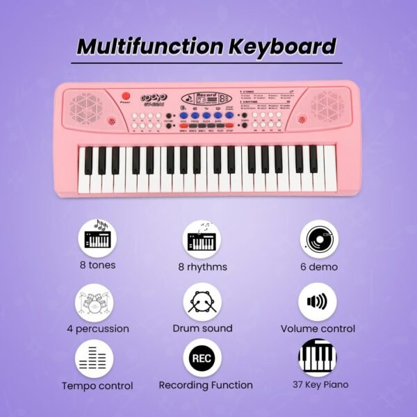 This keyboard is made for young learners who enjoy music, sounds, and hands-on play. The 37 keys are gentle and easy for small fingers to press. Kids can try basic tunes, hear different tones, and learn rhythm patterns. The bright colors and clear speaker make music time exciting. With 8 rhythms, 8 tones, 6 demo songs, and a recording function, the gooyo 37-key musical piano keyboard with microphone and speaker becomes a great starter instrument.