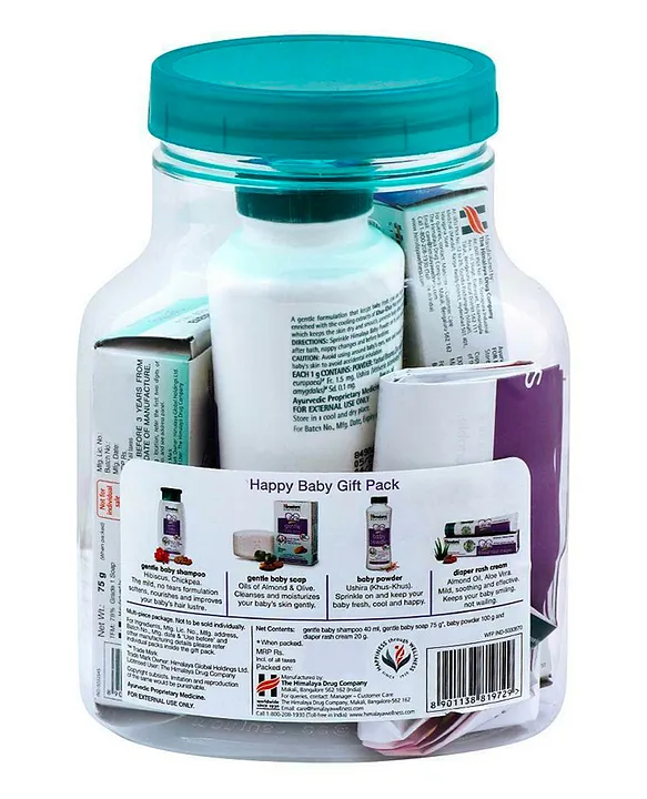 This gift pack includes a gentle baby shampoo with hibiscus and chickpea, a mild baby soap with almond and olive oil, soothing baby powder with ushira (khuskhus), and a diaper rash cream with almond oil and aloe vera to keep your baby fresh, healthy, and smiling all day.