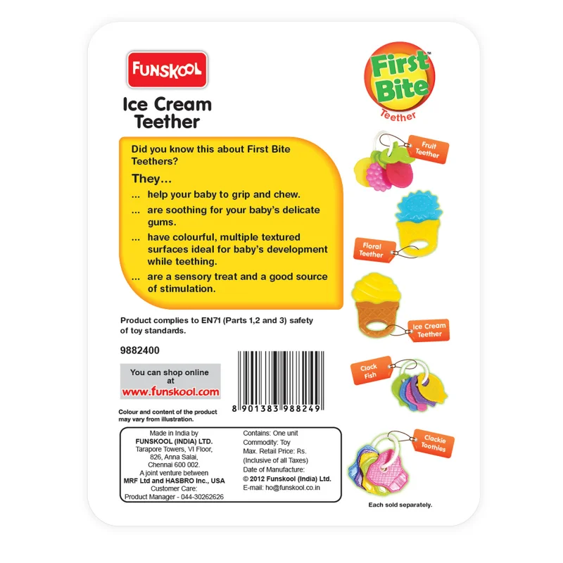 Crafted by Funskool with high-quality, non-toxic materials, this teether helps stimulate the periodontal membrane under the teeth, aiding in jaw development and teaching babies to control their bite pressure. The varied textures and shapes keep your baby engaged while soothing sore gums.