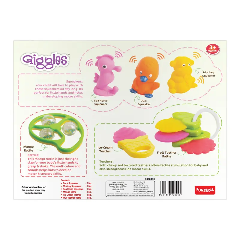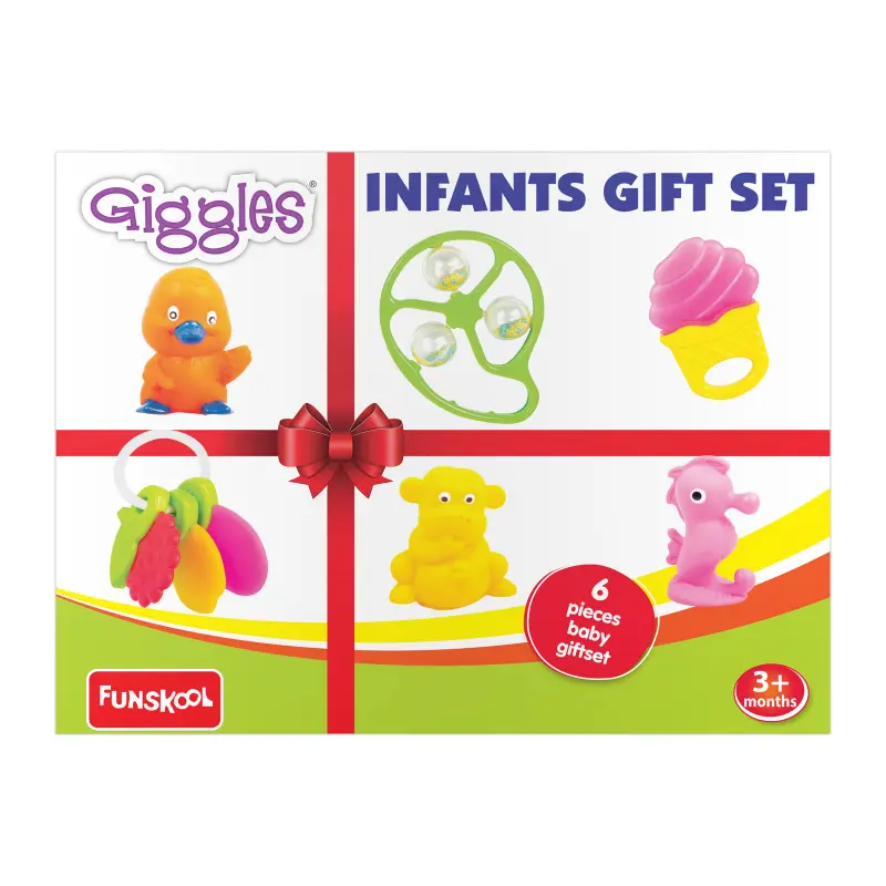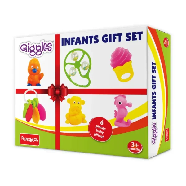 Bring smiles and giggles to your little bundle of joy with the Giggles Infants Gift Set – a specially curated 6-piece toy collection designed for newborns and infants. This charming set includes fun rattles, easy-to-hold squeezy toys, and a chewable teether to comfort teething gums.