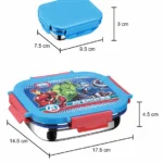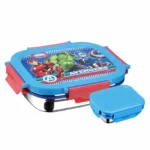 This lunch box is designed with a stainless-steel inner container that keeps food protected and hygienic. The body comes in a bright blue Marvel theme that children love. The size is perfect for school meals, with a main 550 ml container and an additional 80 ml inner dabbi. The inner dabbi helps keep dry snacks, chutneys, or salads separate, making meal times more organized.