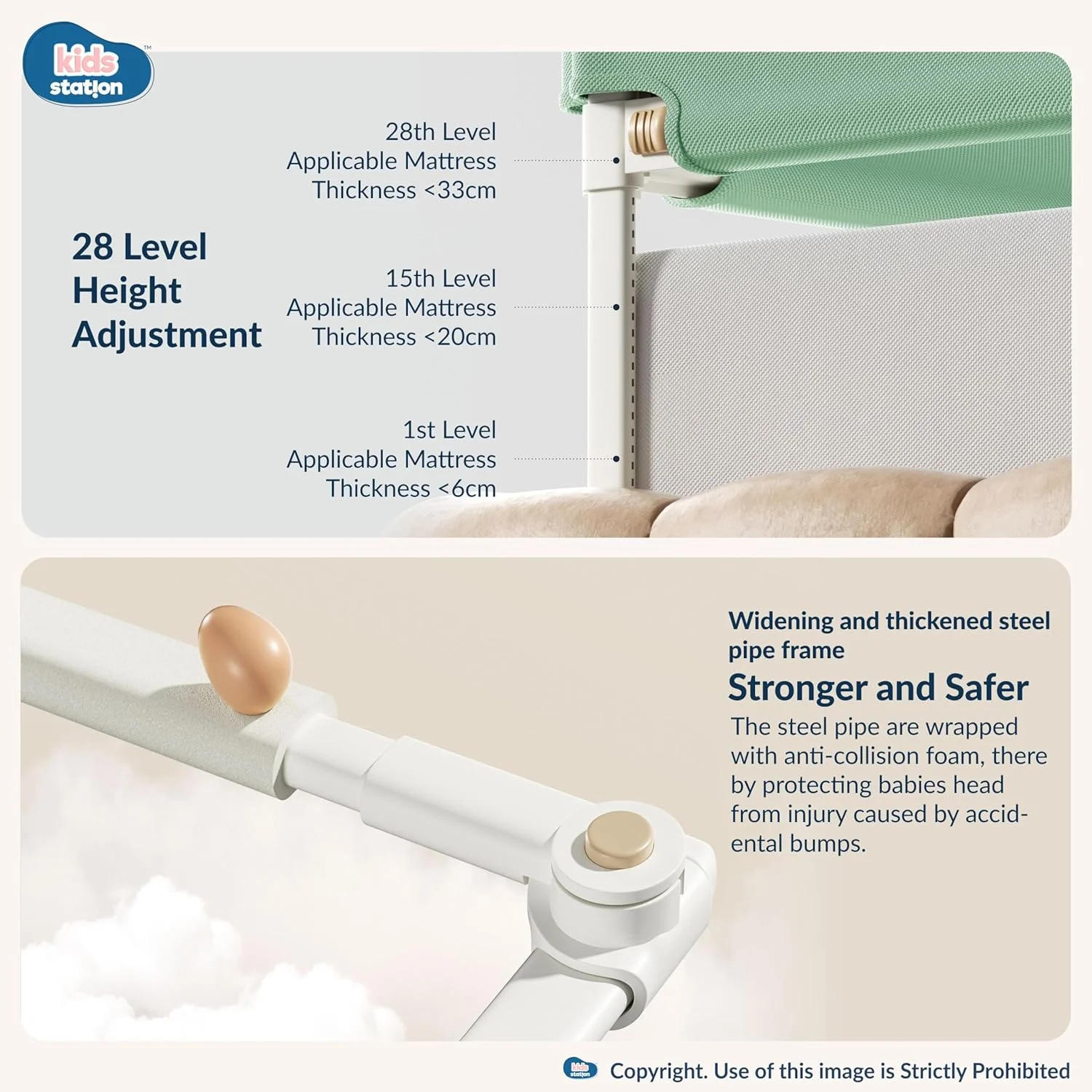Babies roll, crawl, and move in their sleep. This rail guard prevents them from accidentally rolling off the bed. The mesh fabric keeps them safe without blocking airflow. The secure locking system helps the rail stay firm even when pressure is applied. The rail height protects toddlers who stand and move during early walking stages.