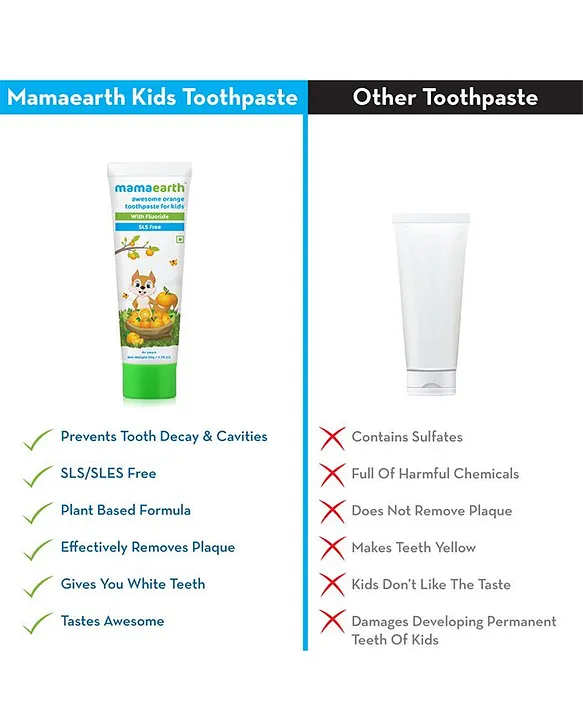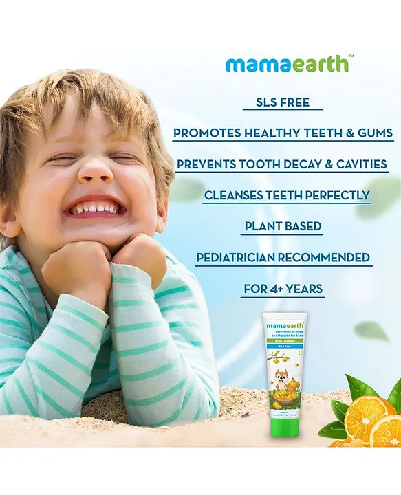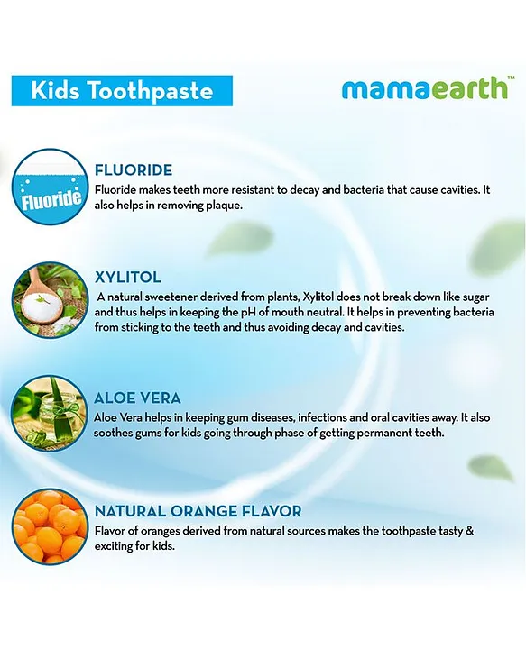 Enriched with Stevia Leaf Extract, it does not produce lactic acid, thus preventing tooth decay naturally. The fluoride-free, SLS-free formula makes it completely safe even if swallowed accidentally. With its yummy orange flavour, your child will love brushing every day!