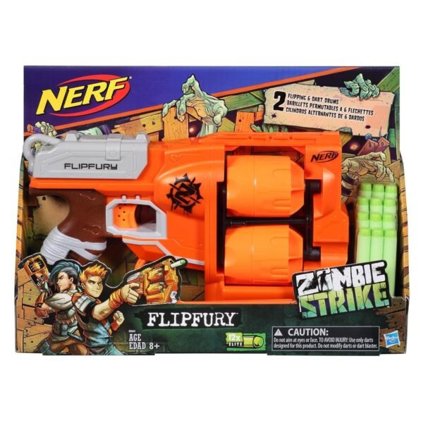 Step into action with the NERF Zombie Strike Flip fury Toy Blaster – the ultimate blaster for intense foam dart battles. Featuring two 6-dart rotating drums, you can shoot up to 12 darts before reloading. Just pull the trigger and flip the drum to stay in the game without missing a beat!