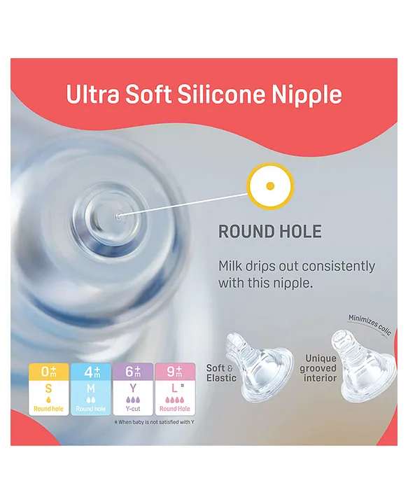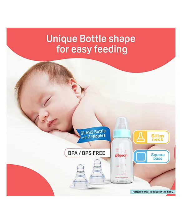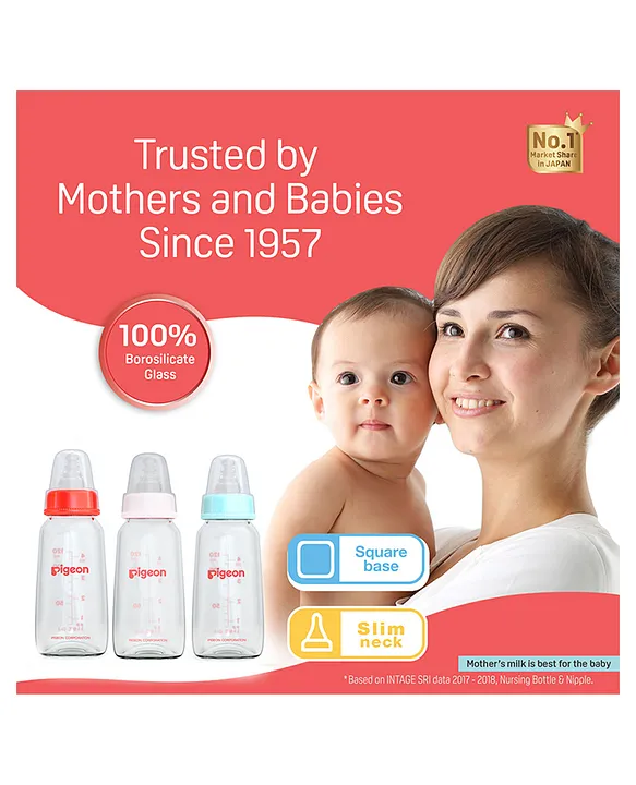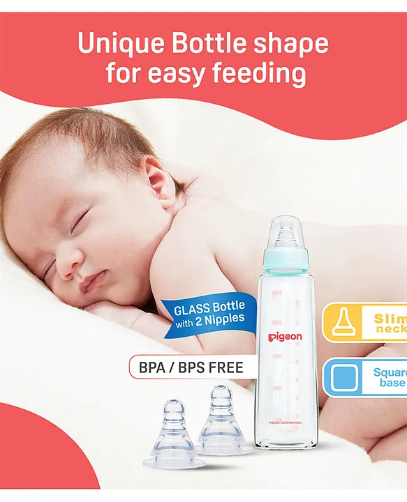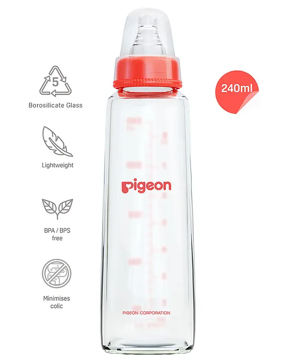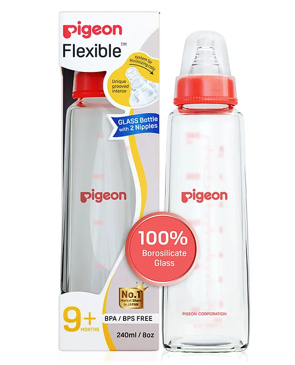 The 240 ml Pigeon Glass Feeding Bottle is perfect for older infants. Made with borosilicate glass, it withstands repeated sterilization. Featuring a medium flow soft silicone nipple, it mimics breastfeeding while reducing air intake with its anti-colic design. The ergonomic shape makes it comfortable to hold and safe for babies.