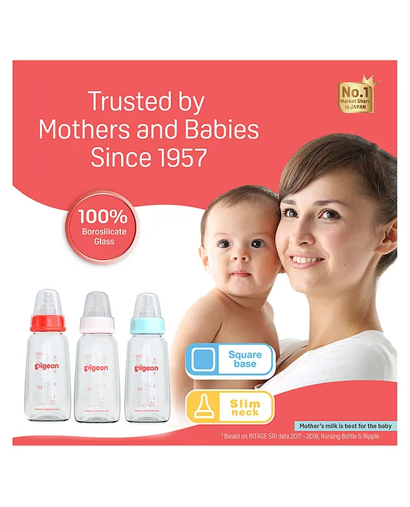 240 ml glass bottle with anti-colic nipple for older infants. BPA-free and available in Blue, Pink & Red.