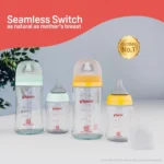 The super soft peristaltic silicone nipple (M-size) mimics the natural feel and movement of the mother’s breast, supporting smooth latch-on and tongue movement. Its anti-colic air ventilation system reduces air intake, helping prevent gas and discomfort. The wide neck and streamlined body make it easy to hold, clean, and sterilize.