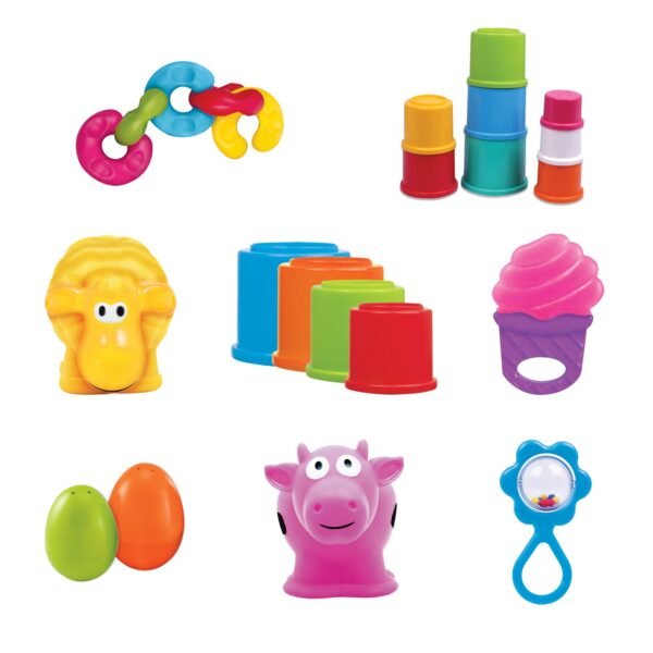 The colourful design of the toys keeps babies visually engaged. Bright colours help babies focus and track movement. The rattle and teether set makes playtime cheerful and stimulating without being overwhelming.